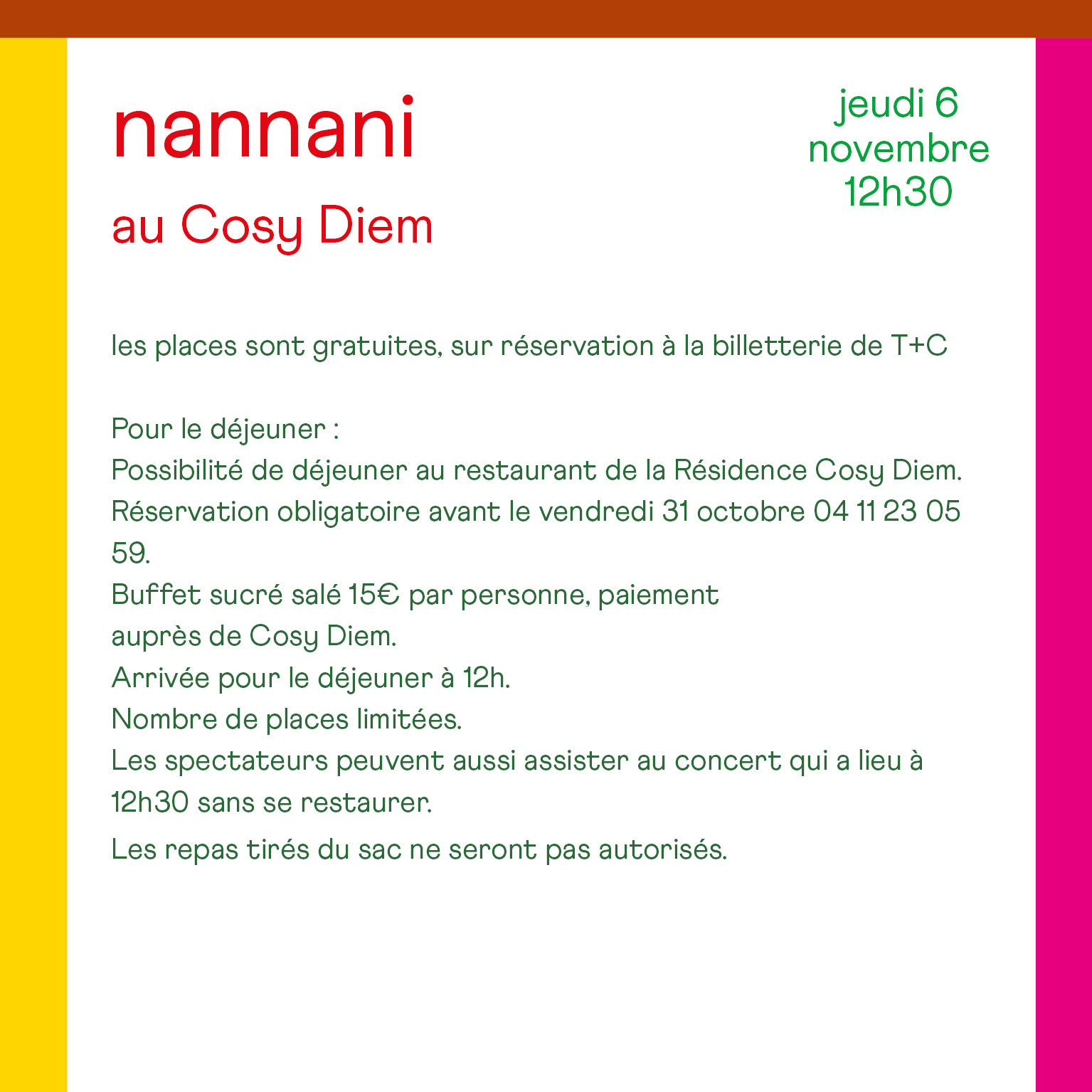 Lilia Ruocco et Léa Lachat, en duo voix et accordéon, vous invitent à partir en Italie du Sud. Au menu : un répertoire original où des classiques napolitains incontournables côtoient des petites perles inconnues venant de Sicile ou des Pouilles. Le duo Nannanì propose un voyage sensitif, où l’on passe du rire aux larmes en l’espace d’une chanson, où l’on sent l’odeur suave du café envahir nos narines, où les images racontées et chantées, nous plongent dans l’Italie des années 80 lors des fêtes familiales autour de Naples.