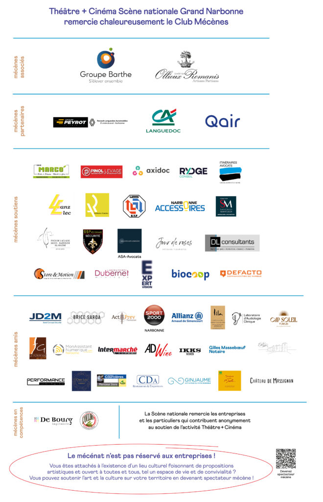 La Scène nationale remercie les entreprises et les particuliers qui contribuent anonymement au soutien de l’activité Théâtre+Cinéma